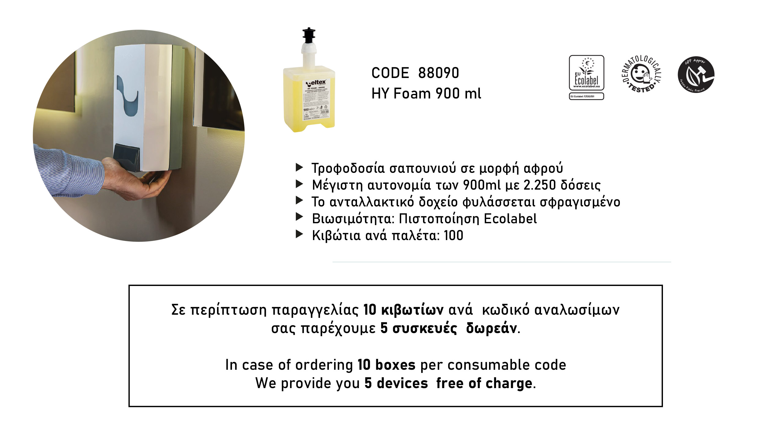 Διατίθεται σε έκδοση Ecolabel και σε νέα φόρμουλα με φυσικά αντιμικροβιακά. Το Megamini Foam συμμορφώνεται με τα πρωτόκολλα HACCP και ανταποκρίνεται σε όλες τις ανάγκες του μπάνιου και της κουζίνας. Το ανταλλακτικό δοχείο των 900ml, εφοδιασμένο με αντλία σαπουνιού αφρού, εγγυάται μέγιστη υγιεινή, αποφεύγοντας τις μολύνσεις.