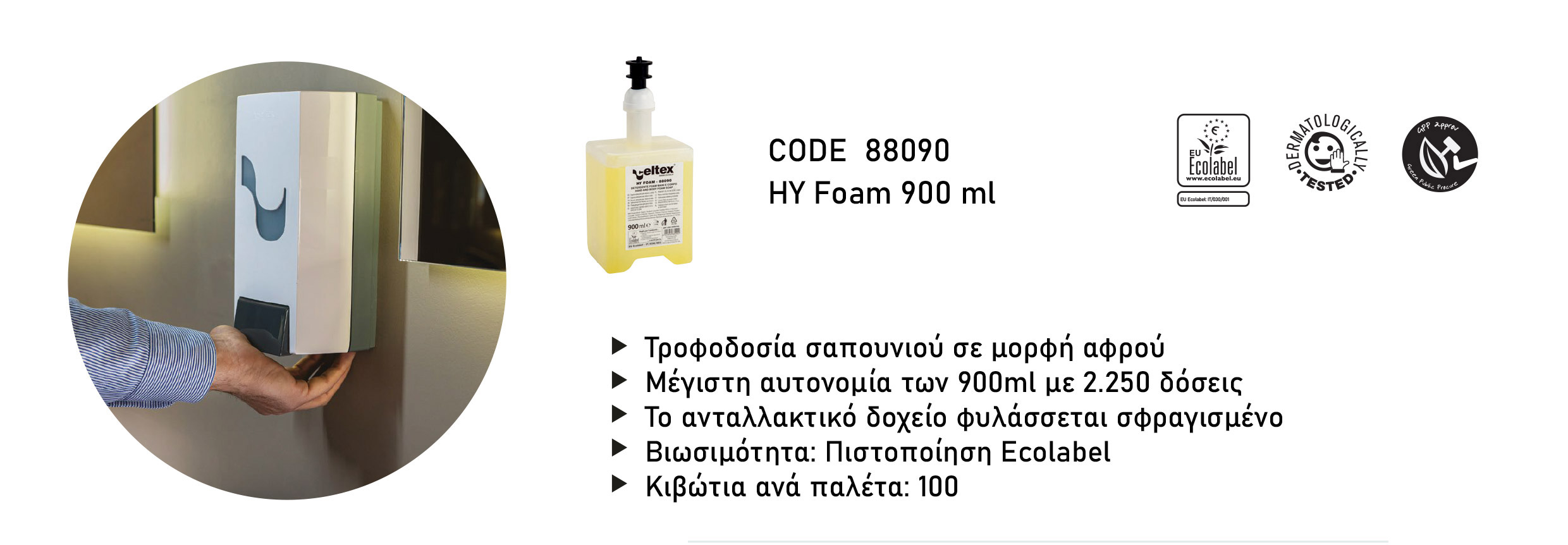 Διατίθεται σε έκδοση Ecolabel και σε νέα φόρμουλα με φυσικά αντιμικροβιακά. Το Megamini Foam συμμορφώνεται με τα πρωτόκολλα HACCP και ανταποκρίνεται σε όλες τις ανάγκες του μπάνιου και της κουζίνας. Το ανταλλακτικό δοχείο των 900ml, εφοδιασμένο με αντλία σαπουνιού αφρού, εγγυάται μέγιστη υγιεινή, αποφεύγοντας τις μολύνσεις.